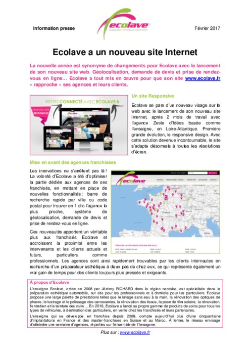 La nouvelle année est synonyme de changements pour Ecolave avec le lancement de son nouveau site web. Géolocalisation, demande de devis et prise de rendez-vous en ligne… Ecolave a tout mis en œuvre pour que son site www.ecolave.fr " rapproche " ses agences et leurs clients.