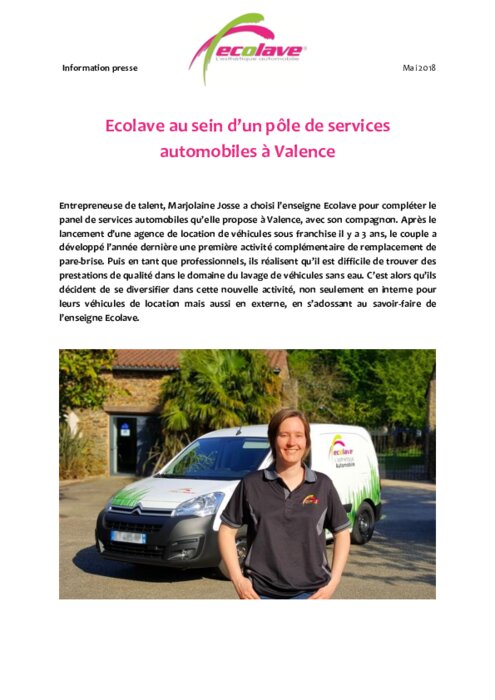 Entrepreneuse de talent, Marjolaine Josse a choisi l’enseigne Ecolave pour compléter le panel de services automobiles qu’elle propose à Valence, avec son compagnon. Après le lancement d’une agence de location de véhicules sous franchise il y a 3 ans, le couple a développé l’année dernière une première activité complémentaire de remplacement de pare-brise.