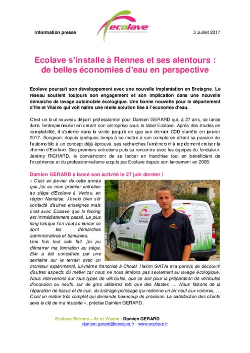 Ecolave poursuit son développement avec une nouvelle implantation en Bretagne. Le réseau soutient toujours son engagement et son implication dans une nouvelle démarche de lavage automobile écologique. Une bonne nouvelle pour le département d’Ille et Vilaine qui voit naître une réelle solution liée à l’économie d’eau.
