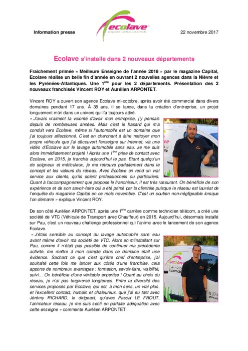 Services 22 novembre 2017 - 11:37 Fraîchement primée " Meilleure Enseigne de l’année 2018 " par le magazine Capital, Ecolave réalise un belle fin d’année en ouvrant 2 nouvelles agences dans la Nièvre et les Pyrénées-Atlantiques. Une 1ere pour les 2 départements. PDF (116 Ko) Télécharger