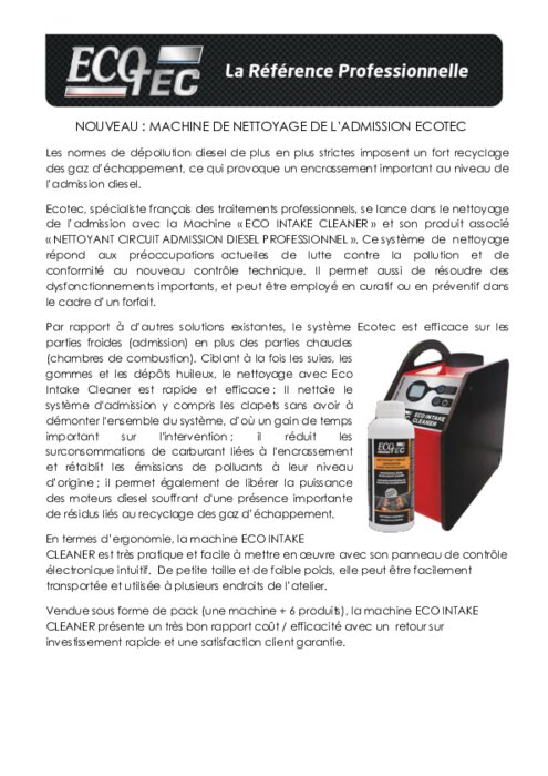 Ecotec, spécialiste français des traitements professionnels, se lance dans le nettoyage de l'admission avec la Machine " ECO INTAKE CLEANER " et son produit associé " NETTOYANT CIRCUIT ADMISSION DIESEL PROFESSIONNEL ". Ce système de nettoyage répond aux préoccupations actuelles de lutte contre la pollution et de conformité au nouveau contrôle technique. Il permet aussi de résoudre des dysfonctionnements importants, et peut être employé en curatif ou en préventif dans le cadre d'un forfait.