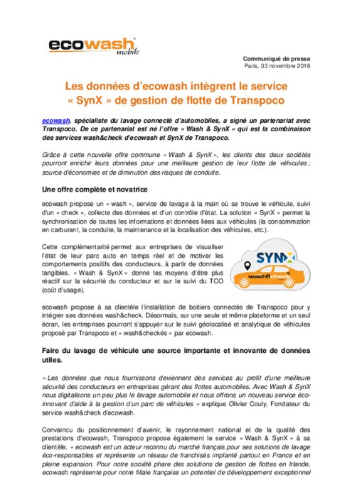 Ecowash, spécialiste du lavage connecté d’automobiles, a signé un partenariat avec Transpoco. De ce partenariat est né l’offre " Wash & SynX " qui est la combinaison des services wash&check d’ecowash et SynX de Transpoco. Gâce à cette nouvelle offre commune " Wash & SynX ", les clients des deux sociétés pourront enrichir leurs données pour une meilleure gestion de leur flotte de véhicules ; source d’économies et de diminution des risques de conduite.