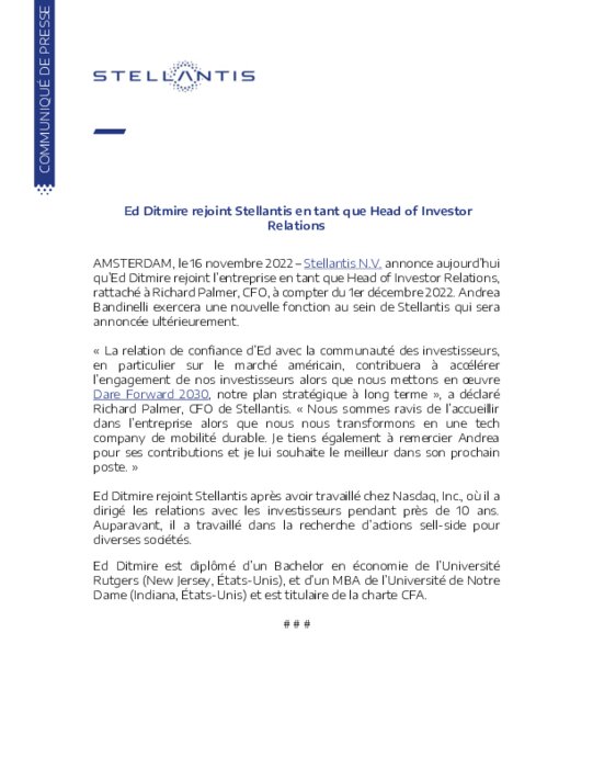 Stellantis N.V. annonce aujourd’hui qu’Ed Ditmire rejoint l’entreprise en tant que Head of Investor Relations, rattaché à Richard Palmer, CFO, à compter du 1er décembre 2022. Andrea Bandinelli exercera une nouvelle fonction au sein de Stellantis qui sera annoncée ultérieurement.