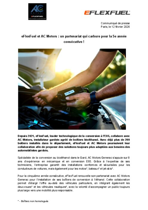 Depuis 2021, eFlexFuel, leader technologique de la conversion à l'E85, collabore avec AC Motors, installateur gardois agréé de boîtiers bioéthanol. Avec déjà plus de 200 boîtiers installés dans le département, eFlexFuel et AC Motors poursuivent leur collaboration afin de proposer des solutions toujours plus adaptées aux besoins des automobilistes gardois.