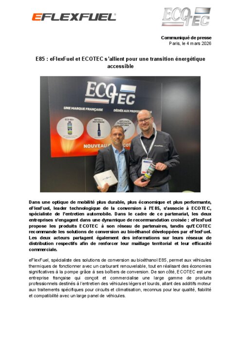 Dans une optique de mobilité plus durable, plus économique et plus performante, eFlexFuel, leader technologique de la conversion à l’E85, s’associe à EcoTec, spécialiste de l’entretien automobile. Dans le cadre de ce partenariat, les deux entreprises s’engagent dans une dynamique de recommandation croisée : eFlexFuel propose les produits EcoTec à son réseau de partenaires, tandis qu’EcoTec recommande les solutions de conversion au bioéthanol développées par eFlexFuel. Les deux acteurs partagent également des informations sur leurs réseaux de distribution respectifs afin de renforcer leur maillage territorial et leur efficacité commerciale.
