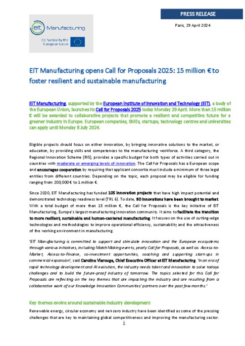 EIT Manufacturing, soutenu par l'Institut européen d'innovation et de technologie (EIT), un organisme de l'Union européenne, lance aujourd'hui lundi 29 avril son appel à propositions 2025. Plus de 15 millions d'euros seront accordés à des projets collaboratifs qui promeuvent un avenir résilient et compétitif pour une industrie plus verte en Europe. Les entreprises européennes, PME, startups, centres technologiques et universités peuvent postuler jusqu'au lundi 8 juillet 2024.