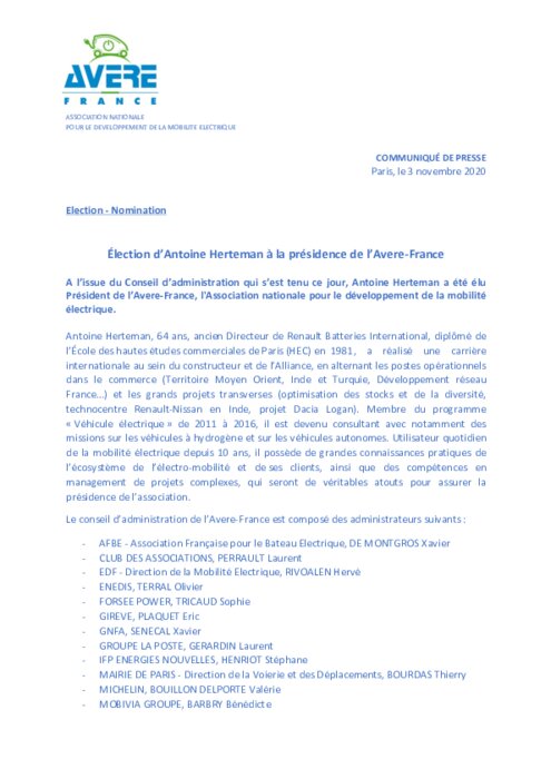 Services 03 novembre 2020 - 16:57 A l'issue du Conseil d'administration qui s'est tenu ce jour, Antoine Herteman a été élu Président de l'Avere-France, l'Association nationale pour le développement de la mobilité électrique. PDF (68 Ko) Télécharger