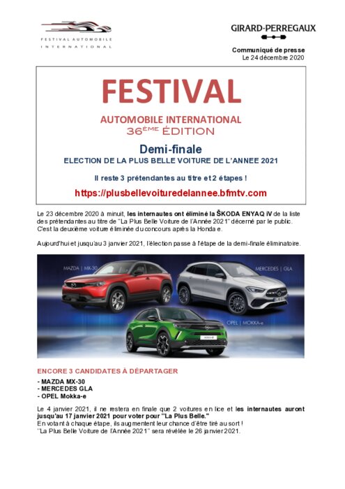 Le 23 décembre 2020 à minuit, les internautes ont éliminé la ŠKODA ENYAQ iV de la liste des prétendantes au titre de "La Plus Belle Voiture de l'Année 2021" décerné par le public. C'est la deuxième voiture éliminée du concours après la Honda e. Aujourd'hui et jusqu'au 3 janvier 2021, l'élection passe à l'étape de la demi-finale éliminatoire.