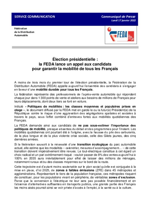 A moins de trois mois du premier tour de l’élection présidentielle, la Fédération de la Distribution Automobile (FEDA) appelle l’ensemble des candidats à s’engager en faveur d’une mobilité durable pour tous les Français. La fédération représente des professionnels de l’après-vente automobile qui répondent chaque jour dans 1 300 points de vente et ateliers aux besoins de millions de Français pour leurs déplacements, dont deux tiers se font en voiture.