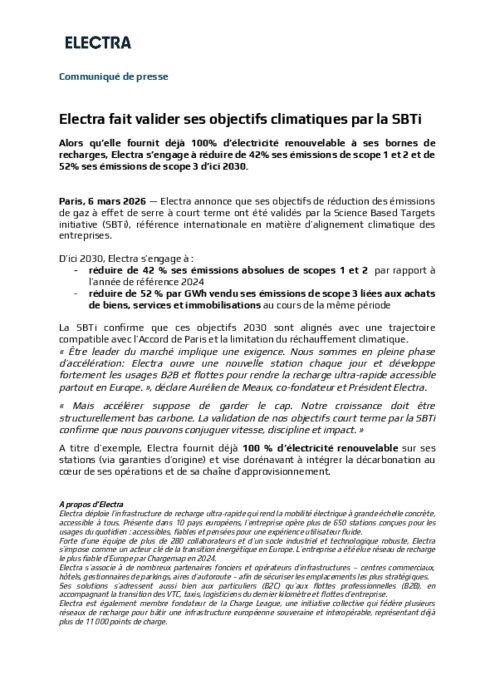 Services 06 mars 2026 - 15:15 Alors qu’elle fournit déjà 100% d’électricité renouvelable à ses bornes de recharges, Electra s’engage à réduire de 42% ses émissions de scope 1 et 2 et de 52% ses émissions de scope 3 d’ici 2030. PDF (53 Ko) Télécharger