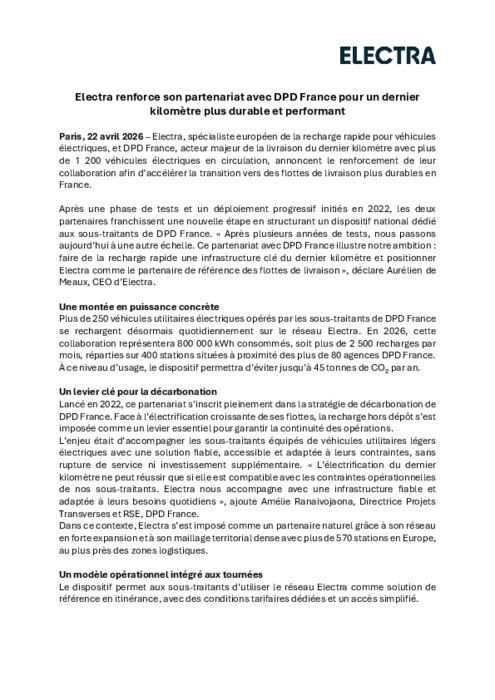 Electra, spécialiste européen de la recharge rapide pour véhicules électriques, et DPD France, acteur majeur de la livraison du dernier kilomètre avec plus de 1 200 véhicules électriques en circulation, annoncent le renforcement de leur collaboration afin d’accélérer la transition vers des flottes de livraison plus durables en France.