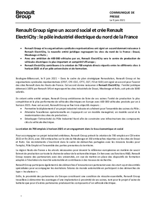 Alors que Renault avait annoncé en mai 2020 la suppression de 15.000 emplois sur trois ans dans le monde, dont 4.600 en France sans licenciements secs, le groupe "confirme" avec ElectriCity sa volonté "de maintenir une activité industrielle dans les trois sites des Hauts-de-France au-delà de 2025 avec des perspectives de recrutement", est-il écrit dans l'accord.