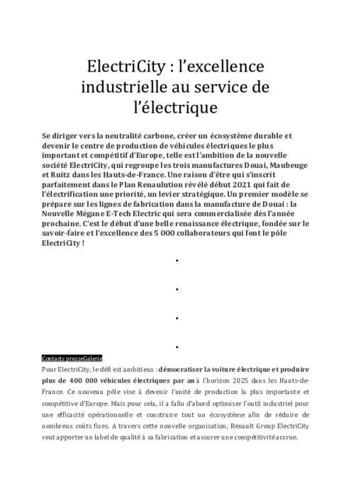 Se diriger vers la neutralité carbone, créer un écosystème durable et devenir le centre de production de véhicules électriques le plus important et compétitif d’Europe, telle est l’ambition de la nouvelle société ElectriCity, qui regroupe les trois manufactures Douai, Maubeuge et Ruitz dans les Hauts-de-France. Une raison d’être qui s’inscrit parfaitement dans le Plan Renaulution révélé début 2021 qui fait de l’électrification une priorité, un levier stratégique.