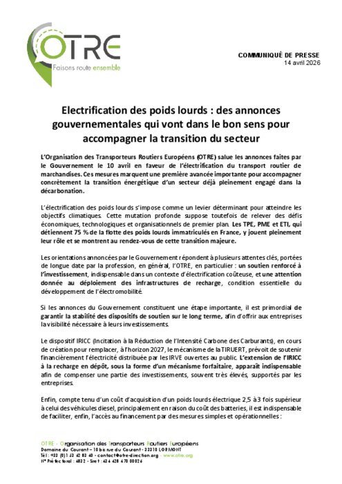 L’Organisation des Transporteurs Routiers Européens (OTRE) salue les annonces faites par le Gouvernement le 10 avril en faveur de l’électrification du transport routier de marchandises. Ces mesures marquent une première avancée importante pour accompagner concrètement la transition énergétique d’un secteur déjà pleinement engagé dans la décarbonation.