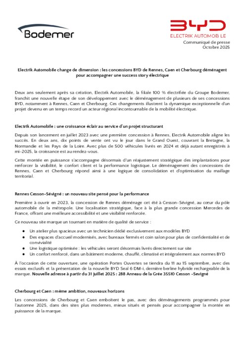 Deux ans seulement après sa création, Electrik Automobile, la filiale 100 % électrifiée du Groupe Bodemer, franchit une nouvelle étape de son développement avec le déménagement de plusieurs de ses concessions BYD, notamment à Rennes, Caen et Cherbourg. Ces changements illustrent la dynamique exceptionnelle d’un projet devenu en un temps record un acteur régional incontournable de la mobilité électrique.