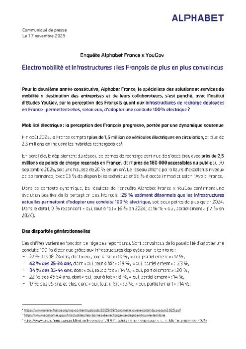 Pour la deuxième année consécutive, Alphabet France, le spécialise des solutions et services de mobilité à destination des entreprises et de leurs collaborateurs, s'est penché, avec l'institut d'études YouGov, sur la perception des Français quant aux infrastructures de recharge déployées en France : permettent-elles, selon eux, d'adopter une conduite 100% électrique ?