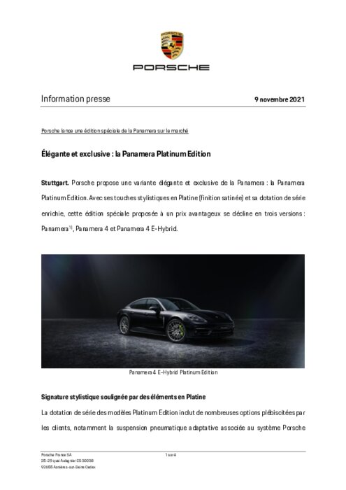 Porsche propose une variante élégante et exclusive de la Panamera : la Panamera Platinum Edition. Avec ses touches stylistiques en Platine (finition satinée) et sa dotation de série enrichie, cette édition spéciale proposée à un prix avantageux se décline en trois versions : Panamera, Panamera 4 et Panamera 4 E-Hybrid.