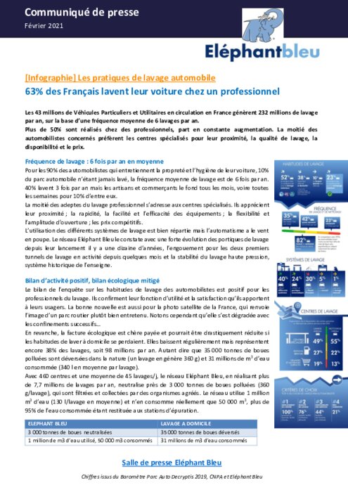 Les 43 millions de Véhicules Particuliers et Utilitaires en circulation en France génèrent 232 millions de lavage par an, sur la base d’une fréquence moyenne de 6 lavages par an. Plus de 50% sont réalisés chez des professionnels, part en constante augmentation. La moitié des automobilistes concernés préfèrent les centres spécialisés pour leur proximité, la qualité de lavage, la disponibilité et le prix.