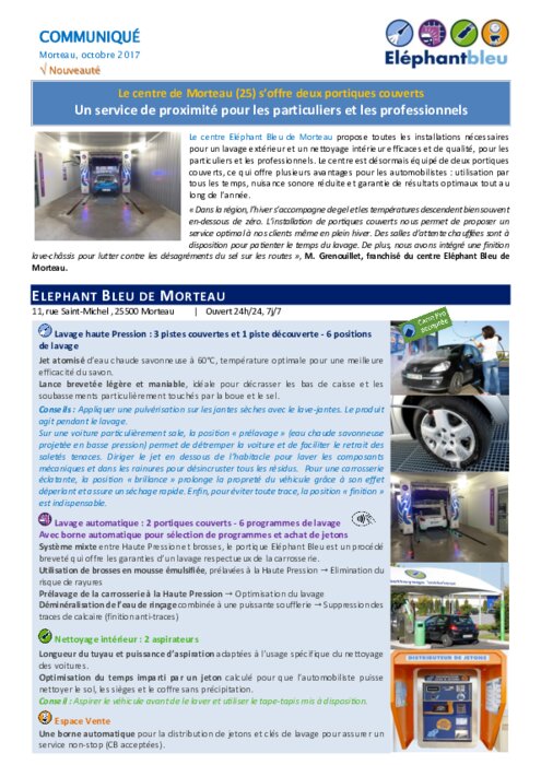 Le centre Eléphant Bleu de Morteau propose toutes les installations nécessaires pour un lavage extérieur et un nettoyage intérieur efficaces et de qualité, pour les particuliers et les professionnels. Le centre est désormais équipé de deux portiques couverts, ce qui offre plusieurs avantages pour les automobilistes : utilisation par tous les temps, nuisance sonore réduite et garantie de résultats optimaux tout au long de l'année.