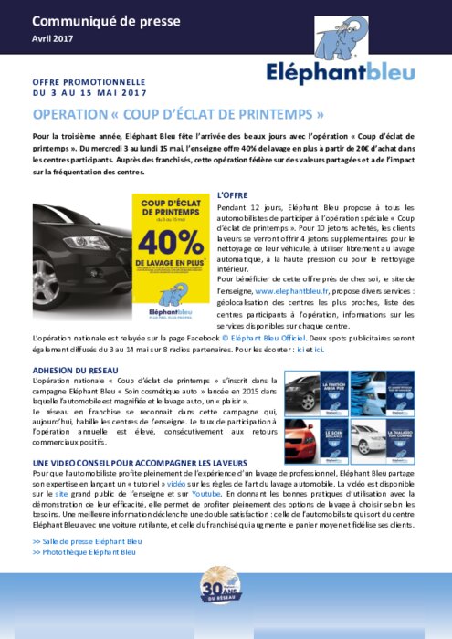 Pour la troisième année, Eléphant Bleu fête l’arrivée des beaux jours avec l’opération "Coup d’éclat de printemps". Du mercredi 3 au lundi 15 mai, l’enseigne offre 40% de lavage en plus à partir de 20€ d’achat dans les centres participants. Auprès des franchisés, cette opération fédère sur des valeurs partagées et a de l’impact sur la fréquentation des centres.
