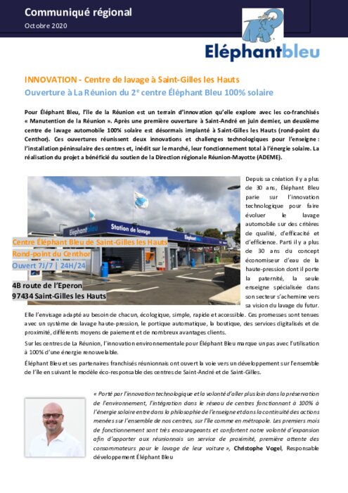 Pour Éléphant Bleu, l’île de la Réunion est un terrain d’innovation qu’elle explore avec les co-franchisés « Manutention de la Réunion ». Après une première ouverture à Saint-André en juin dernier, un deuxième centre de lavage automobile 100% solaire est désormais implanté à Saint-Gilles les Hauts (rond-point du Centhor). Ces ouvertures réunissent deux innovations et challenges technologiques pour l’enseigne...