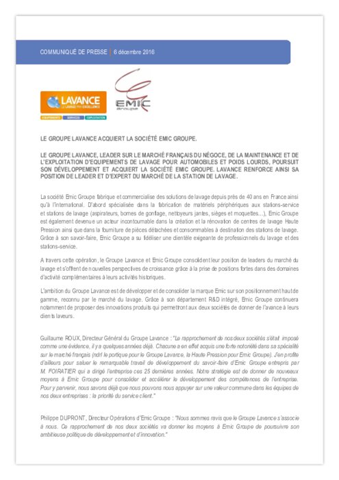 Le Groupe Lavance et Emic Groupe consolident leur position de leaders du marché du lavage et s’offrent de nouvelles perspectives de croissance grâce à la prise de positions fortes dans des domaines d’activité complémentaires à leurs activités historiques.