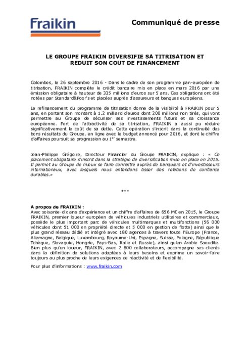 Dans le cadre de son programme pan-européen de titrisation, FRAIKIN complète le crédit bancaire mis en place en mars 2016 par une émission obligataire à hauteur de 335 millions d'euros sur 5 ans. Ces obligations ont été notées par Standard&Poor's et placées auprès d'assureurs et banques européens.