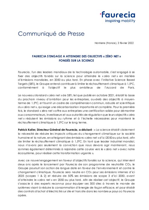 Faurecia, l'un des leaders mondiaux de la technologie automobile, s’est engagé à se fixer des objectifs fondés sur la science pour atteindre le « zéro net » en matière d’émissions mondiales, en 2050 au plus tard. En phase avec l’initiative Science Based Targets (SBTi), le Groupe entend contribuer à limiter le réchauffement climatique à 1,5°C, conformément à l’objectif le plus ambitieux de l’Accord de Paris.