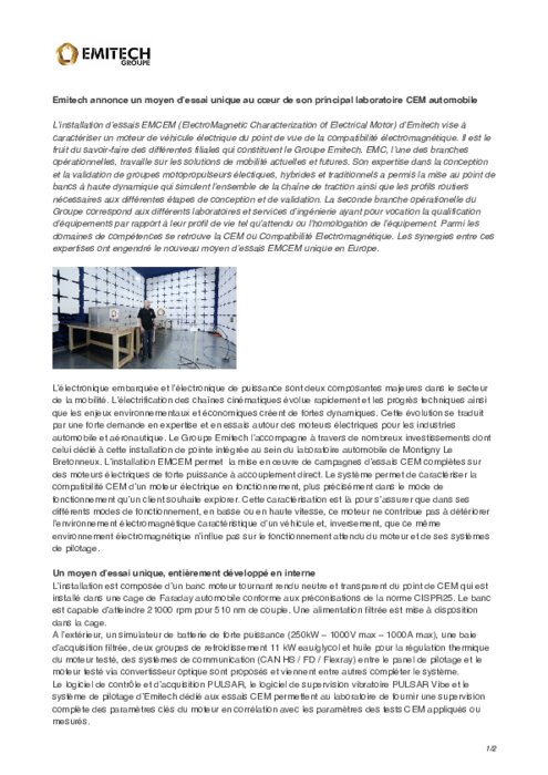 Emitech annonce un moyen d’essai unique au cœur de son principal laboratoire CEM automobile | L’installation d’essais EMCEM (ElectroMagnetic Characterization of Electrical Motor) d’Emitech vise à caractériser un moteur de véhicule électrique du point de vue de la compatibilité électromagnétique. Il est le fruit du savoir-faire des différentes filiales qui constituent le Groupe Emitech. EMC, l’une des branches opérationnelles, travaille sur les solutions de mobilité actuelles et futures.