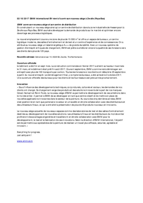 Equipementiers 10 octobre 2017 - 17:10 En construisant un nouveau siège ainsi qu'un centre de distribution dans la zone industrielle de Hessenpoort à Zwolle aux Pays-Bas, EMM souhaite développer la demande de produits sur le marché et optimiser encore davantage ses processus logistiques. PDF (4 Ko) Télécharger