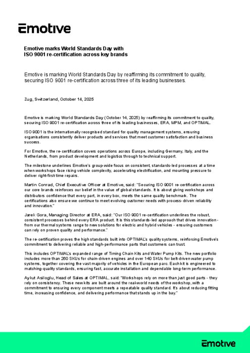 Emotive célèbre la Journée mondiale de la normalisation (14 octobre 2025) en réaffirmant son engagement envers la qualité, en obtenant la recertification ISO 9001 pour trois de ses principales activités, ERA, MPM et OPTIMAL. La norme ISO 9001 est la norme internationalement reconnue pour les systèmes de gestion de la qualité. Elle garantit que les organisations fournissent de manière constante des produits et des services qui satisfont les clients et assurent le succès commercial.