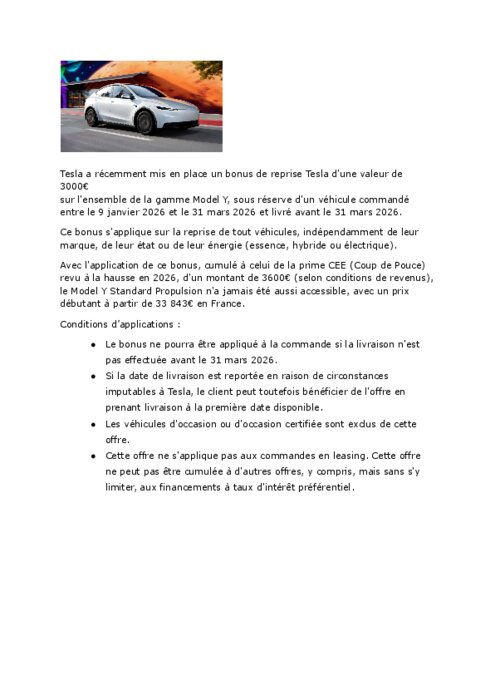 Avec l'application de ce bonus, cumulé à celui de la prime CEE (Coup de Pouce) revu à la hausse en 2026, d'un montant de 3600€ (selon conditions de revenus), le Model Y Standard Propulsion n'a jamais été aussi accessible, avec un prix débutant à partir de 33 843€ en France.