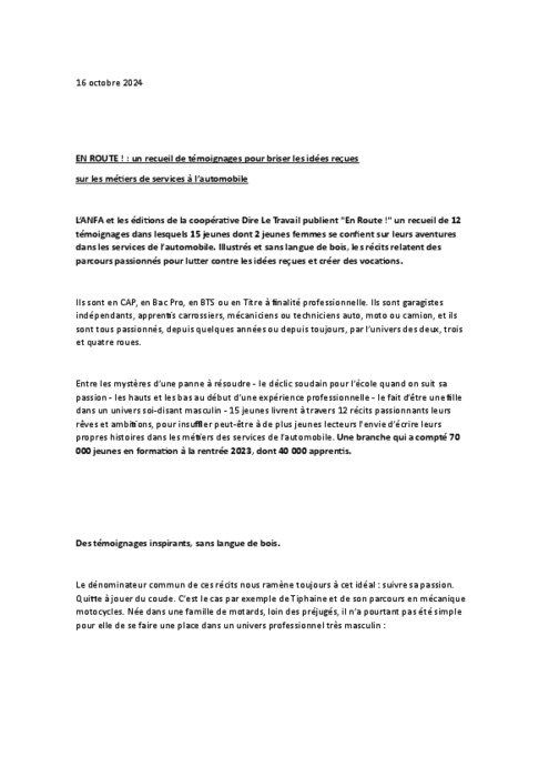 L’ANFA et les éditions de la coopérative Dire Le Travail publient "En Route !" un recueil de 12 témoignages dans lesquels 15 jeunes dont 2 jeunes femmes se confient sur leurs aventures dans les services de l’automobile. Illustrés et sans langue de bois, les récits relatent des parcours passionnés pour lutter contre les idées reçues et créer des vocations.