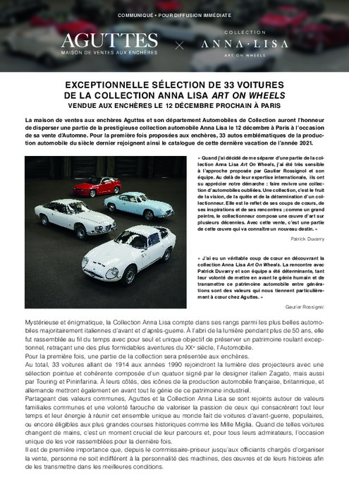 La maison de ventes aux enchères Aguttes et son département Automobiles de Collection auront l’honneur de disperser une partie de la prestigieuse collection automobile Anna Lisa le 12 décembre à Paris à l’occasion de sa vente d’Automne. Pour la première fois proposées aux enchères, 33 autos emblématiques de la production automobile du siècle dernier rejoignent ainsi le catalogue de cette dernière vacation de l’année 2021.