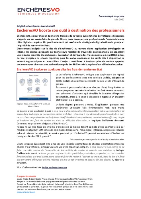 EnchèresVO booste son outil à destination des professionnels. Directement intégrés sur le site de d'EnchèresVO au travers d'une application, les services proposés facilitent le travail des professionnels en apportant une réponse concrète à leurs besoins. Évaluation et chiffrage des frais de remise en état (FRE), prises de vue intégrées ou encore reporting pour les concessionnaires : les outils mis à disposition se veulent ergonomiques et accessibles.