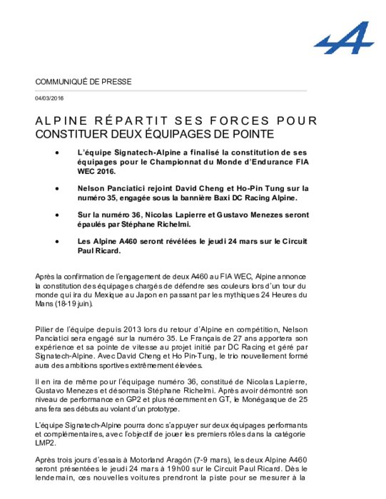 L’équipe Signatech-Alpine a finalisé la constitution de ses équipages pour le Championnat du Monde d’Endurance FIA WEC 2016. Nelson Panciatici rejoint David Cheng et Ho-Pin Tung sur la numéro 35, engagée sous la bannière Baxi DC Racing Alpine. Sur la numéro 36, Nicolas Lapierre et Gustavo Menezes seront épaulés par Stéphane Richelmi. Les Alpine A460 seront révélées le jeudi 24 mars sur le Circuit Paul Ricard.