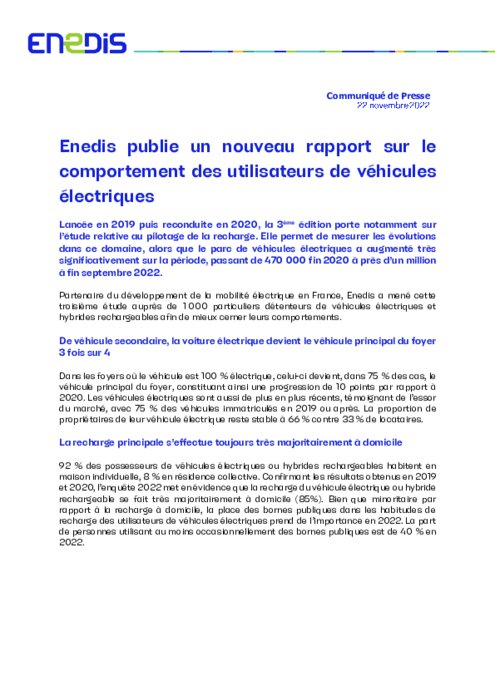 Lancée en 2019 puis reconduite en 2020, la 3ème édition porte notamment sur l’étude relative au pilotage de la recharge. Elle permet de mesurer les évolutions dans ce domaine, alors que le parc de véhicules électriques a augmenté très significativement sur la période, passant de 470 000 fin 2020 à près d’un million à fin septembre 2022.