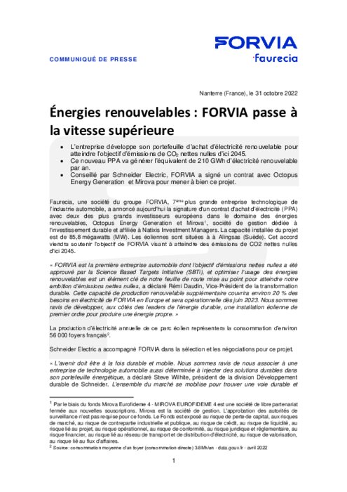 Faurecia, une société du groupe FORVIA, 7ème plus grande entreprise technologique de l’industrie automobile, a annoncé aujourd'hui la signature d'un contrat d'achat d'électricité (PPA) avec deux des plus grands investisseurs européens dans le domaine des énergies renouvelables, Octopus Energy Generation et Mirova, société de gestion dédiée à l'investissement durable et affiliée à Natixis Investment Managers.