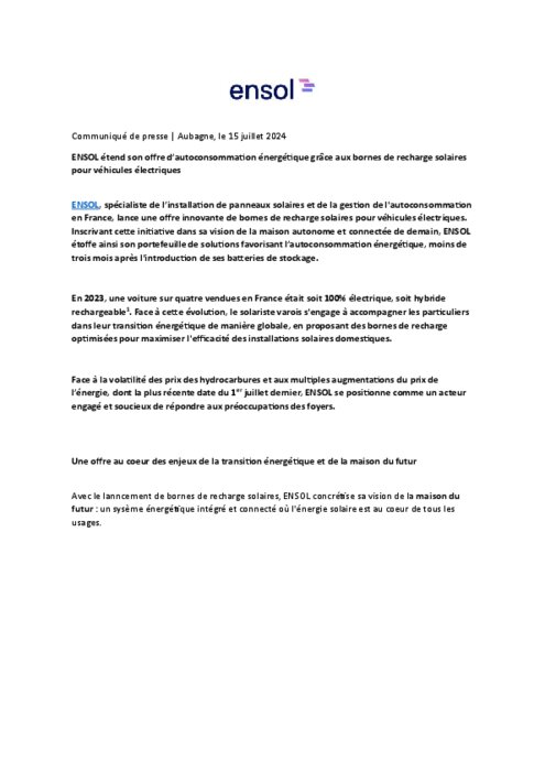 ENSOL, spécialiste de l’installation de panneaux solaires et de la gestion de l'autoconsommation en France, lance une offre innovante de bornes de recharge solaires pour véhicules électriques. Inscrivant cette initiative dans sa vision de la maison autonome et connectée de demain, ENSOL étoffe ainsi son portefeuille de solutions favorisant l’autoconsommation énergétique, moins de trois mois après l'introduction de ses batteries de stockage.