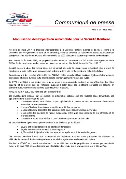 La CFEA a mobilisé la profession pour que les experts en automobile réalisent les contrôles dans les délais impartis et s’assurent que les véhicules puissent circuler dans des conditions normales de sécurité en demandant leur remise en conformité quand leur état le justifie. Ainsi, au 30 juin 2017, 663 véhicules ont été expertisés. L’opération 1030 VO se poursuit actuellement pour les véhicules dont les propriétaires ne se sont pas manifestés avant le 21 avril 2017.