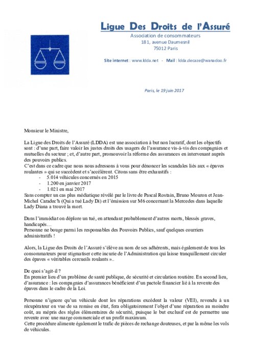 La Ligue des Droits de l’Assuré (LDDA) adresse une lettre ouverte au ministre des Transports où elle veut faire une proposition constructive, au nom de ses adhérents mais également de tous les consommateurs, qui peuvent à un moment ou un autre être concernés: il serait souhaitable de tarir la source de ces scandales aux épaves roulantes qui provient de la possibilité donnée aux assureurs, par le biais de l’article 372-2 § 2 du code de la route, de vendre pour réparation le véhicule endommagé.