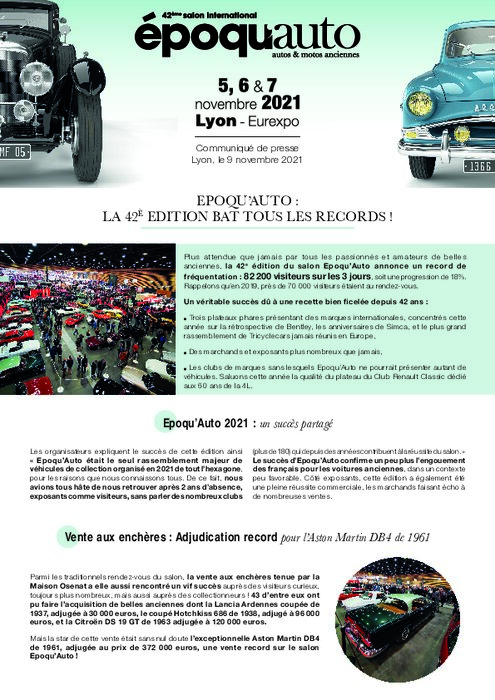 Plus attendue que jamais par tous les passionnés et amateurs de belles anciennes, la 42e édition du salon Epoqu’Auto annonce un record de fréquentation : 82 200 visiteurs sur les 3 jours, soit une progression de 18%. Rappelons qu’en 2019, près de 70 000 visiteurs étaient au rendez-vous.