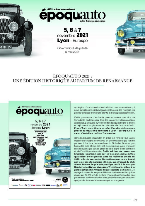 Les nouvelles dates du salon EPOQU’AUTO sont confirmées ! La 42e édition initialement prévue en novembre 2020 n’a pas pu se tenir dans le cadre des restrictions gouvernementales dues à la crise sanitaire. Le club des 3A, organisateur d’EPOQU’AUTO, est donc ravi de confirmer que, du 5 au 7 novembre 2021, se tiendra cette 42e édition au parc Eurexpo de Lyon-Chassieu !
