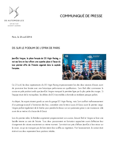 Jean-Éric Vergne, le pilote français de DS Virgin Racing, a ravi ses fans en leur offrant une superbe place à l’issue du tout premier ePrix de l’histoire organisé dans la capitale française. Ce 23 avril, les deux représentants du DS Virgin Racing impressionnaient lors des deux séances d’essais avant de poursuivre leur lancée avec une fantastique performance en qualifications.