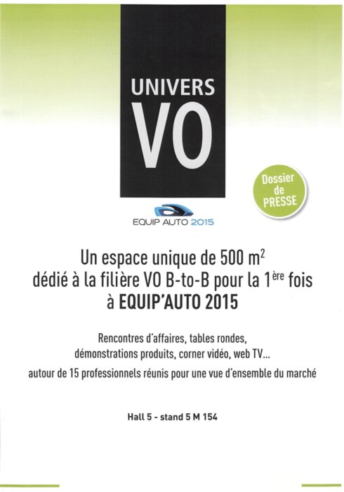 13 exposants de premier plan aux profils complémentaires sont présents sur l'espace mutualisé Univers VO pour donner aux professionnels une vue d'ensemble du marché (Calandre Automobile, CarGarantie, Cardiff, Digitaleo, Icare, Le Mobiliste, Stockaz, STVA, VPN, Alpine Electronics, Appro Automobile, Auto Consultant, BC Auto Enchères).