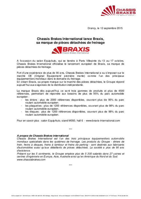 Equipementiers 12 octobre 2015 - 15:08 A l’occasion du salon Equip Auto, Chassis Brakes International officialise le lancement européen de Braxis, sa marque de pièces détachées de freinage... Cliquez ici pour retouver toutes les infos Equip Auto 2015 PDF (140 Ko) Télécharger