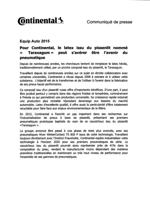 En 2015, Continental a franchit un pas important dans ses recherches sur l’industrialisation de pneus à base de pissenlit, présentant ses premiers pneumatiques prototypes baptisés du nom de ce caoutchouc issu du pissenlit «Taraxagum ». Le groupe annonce être passé à une phase de tests plus avancée, avec ses pneumatiques Hiver WinterContact TS 850 P issus de cette technologie.