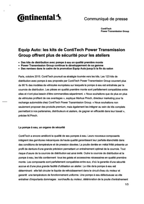 ContiTech poursuit sa stratégie tournée vers les kits. Les 123 kits de distribution avec pompe à eau proposés par ContiTech Power Transmission Group couvrent plus de 90 % des modèles de véhicules européens sur lesquels la pompe à eau est entraînée par la courroie de distribution. Les pièces en qualité première monte sont parfaitement compatibles entre elles et n’ont plus besoin d’être commandées séparément.