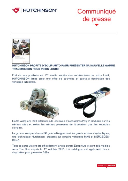 Fort de ses positions en 1ère monte auprès des constructeurs de poids lourd, HUTCHINSON lance toute une offre de courroies et galets à destination des véhicules industriels. L’offre comprend 203 références de courroies d’accessoires Poly V produites sur les mêmes sites et selon les mêmes processus de fabrication que les courroies d’origine.