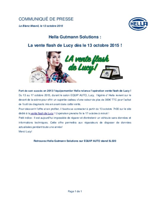 Fort de son succès en 2013 Hella relance l’opération vente flash de Lucy! Du 13 au 17 octobre 2015, durant le salon EQUIP AUTO, Lucy, l’égérie d’Hella revient sur le devant de la scène pour offrir un superbe cadeau d’une valeur de plus de 300€ TTC pour l’achat de l’outil de diagnostic mis en avant dans cette vente. Pour découvrir l’offre et en profiter, il faudra se connecter à partir du 13 octobre 7h00 sur le site dédié à la vente flash de Lucy!